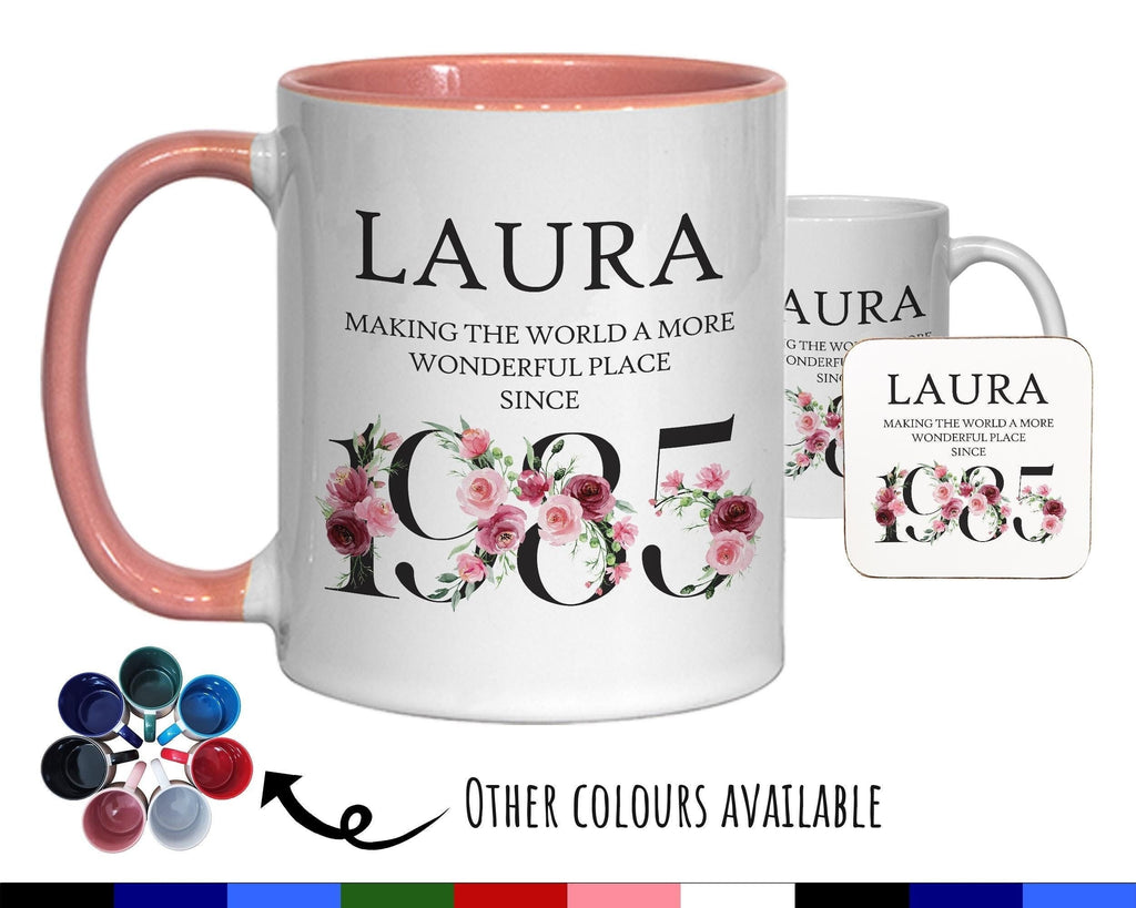 40th Birthday Gift for Women - Wonderful Since 1985 Personalised Coffee Mug Coaster Age 40 Gift for Her Ladies Floral Design Mum Nan BND40M