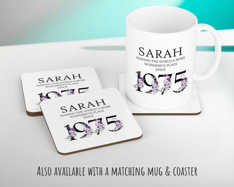 Our 50th birthday cushion is sure to make an amazing keepsake gift - Designed with a feminine floral 1975 design, it will look wonderful in any ladies home - Ideal for Mum, Nan, Grandma or family friends. Also available with a matching mug and coaster.