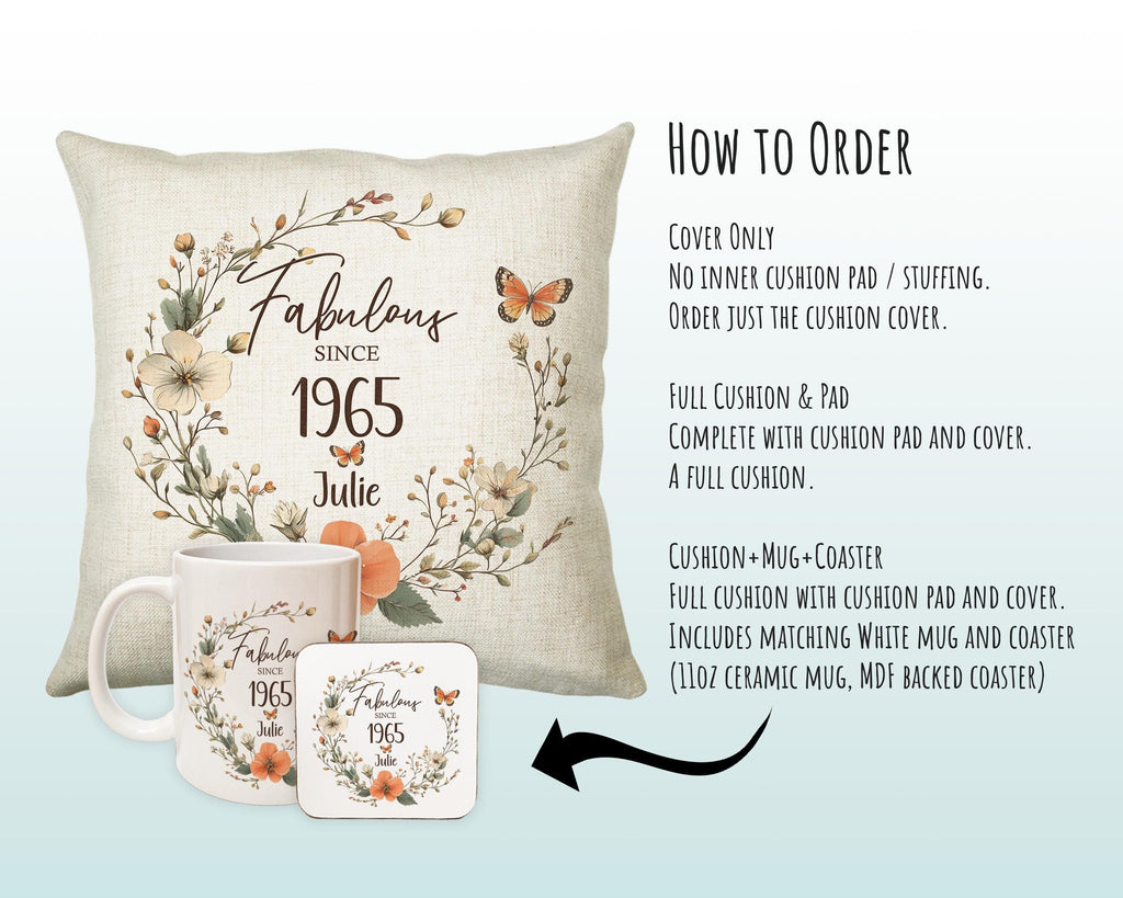 Our 60th birthday cushion is sure to make an amazing keepsake gift - Designed with a feminine floral 1965 design, it will look wonderful in any ladies home - Ideal for Mum, Nan, Grandma or family friends. Also available with a matching mug and coaster.