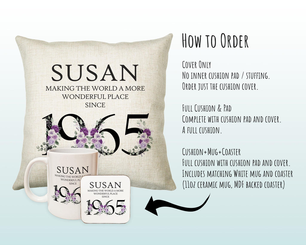 Our 60th birthday cushion is sure to make an amazing keepsake gift - Designed with a feminine floral 1965 design, it will look wonderful in any ladies home - Ideal for Mum, Nan, Grandma or family friends. Also available with a matching mug and coaster.
