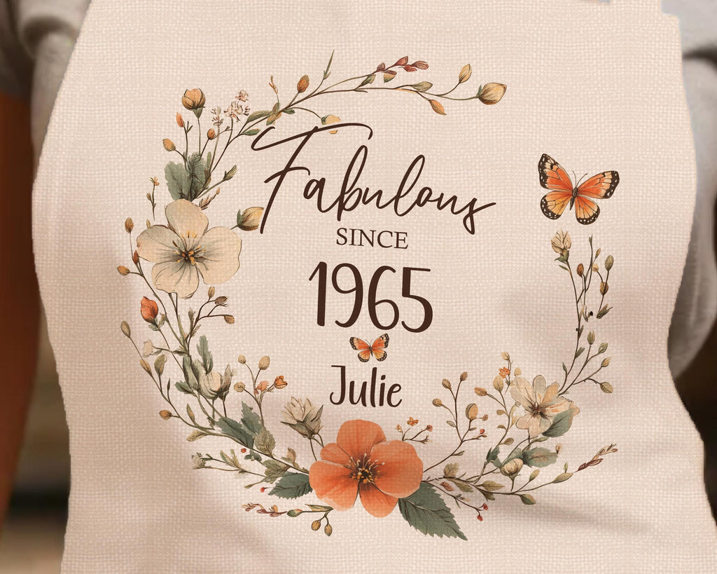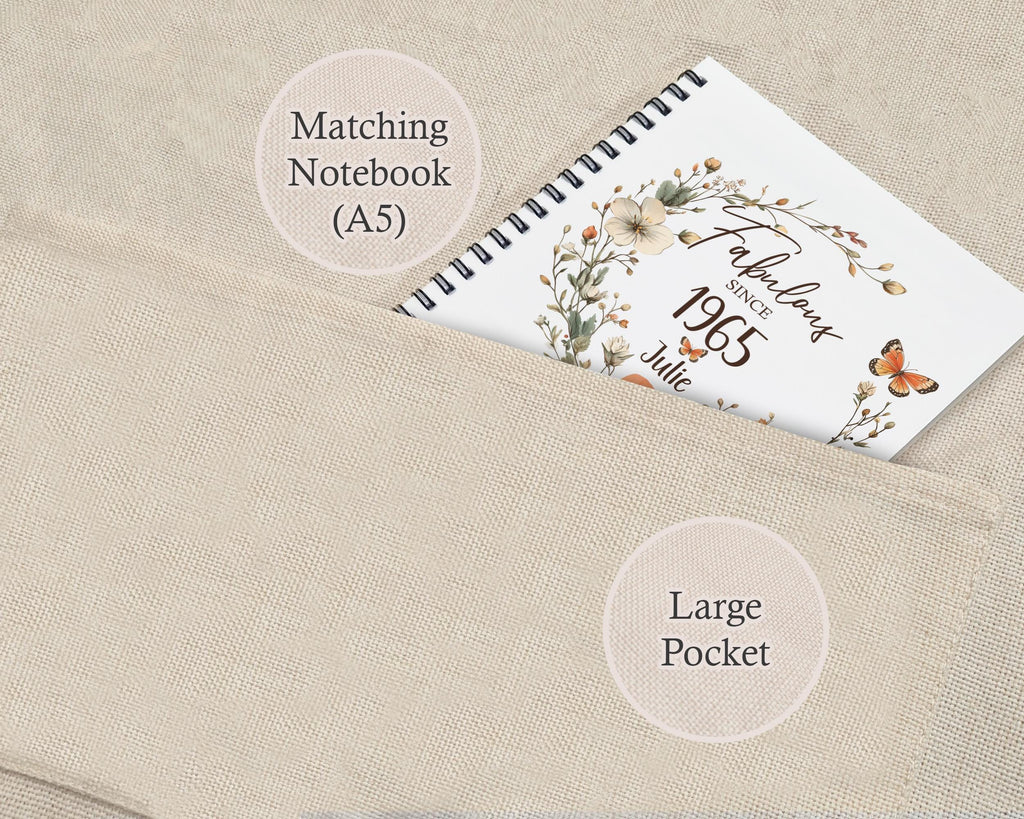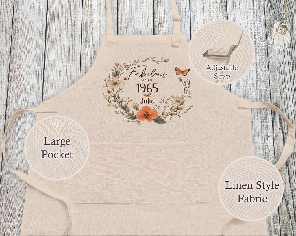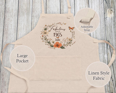 Our 60th birthday personalised apron is sure to make an amazing keepsake gift - Designed with a feminine floral butterfly 1965 design, it will look wonderful in any ladies kitchen - We can change the age, making it the ideal gift for Mum, Daughter, Sister, Nan, Grandma, Godmother or family friends. Also available with a matching notebook.