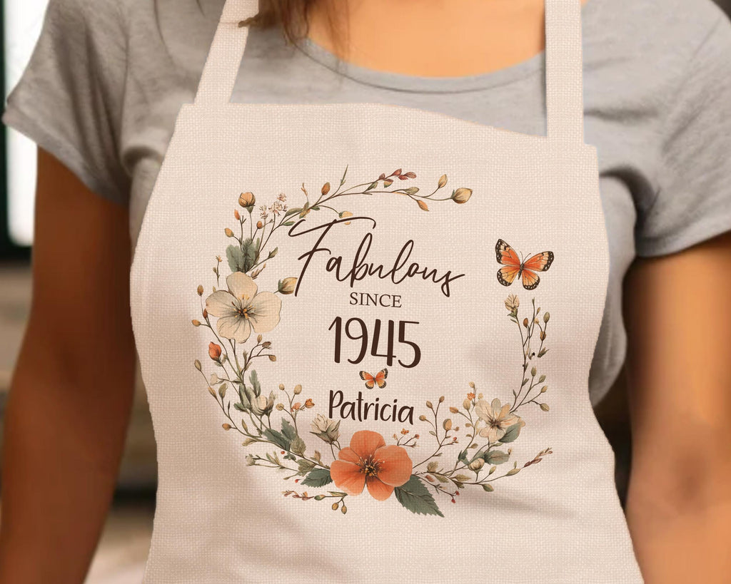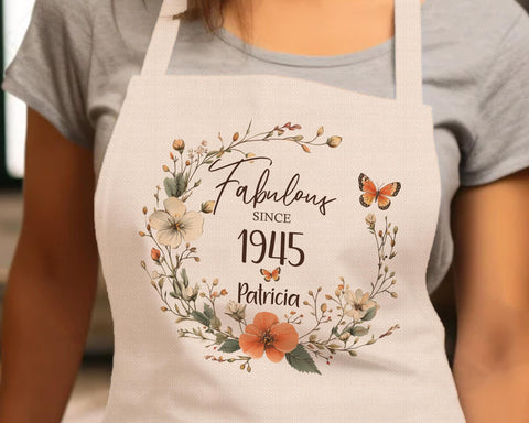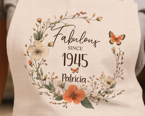Our 80th birthday personalised apron is sure to make an amazing keepsake gift - Designed with a feminine floral butterfly 1945 design, it will look wonderful in any ladies kitchen - We can change the age, making it the ideal gift for Mum, Daughter, Sister, Nan, Grandma, Godmother or family friends. Also available with a matching notebook.