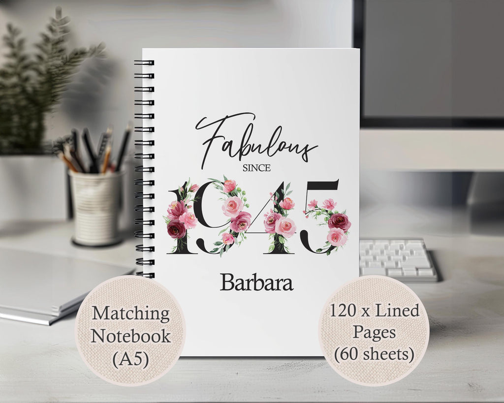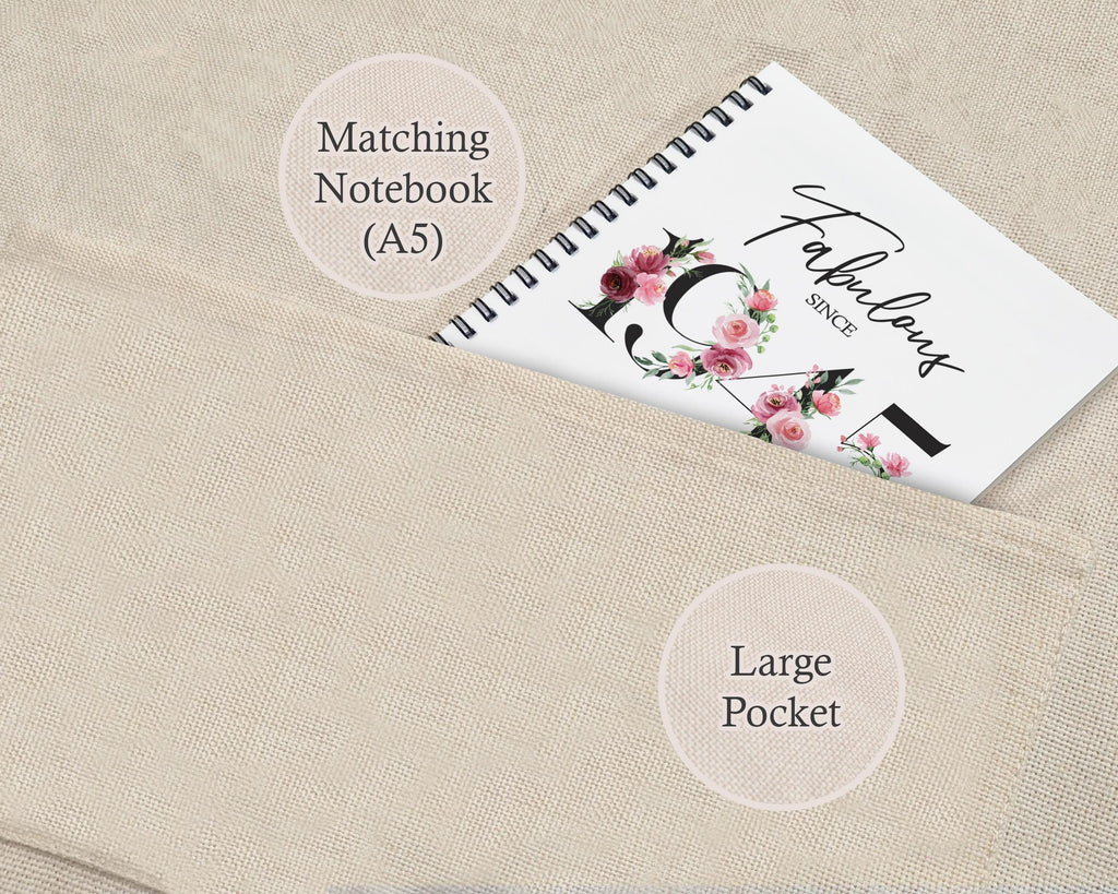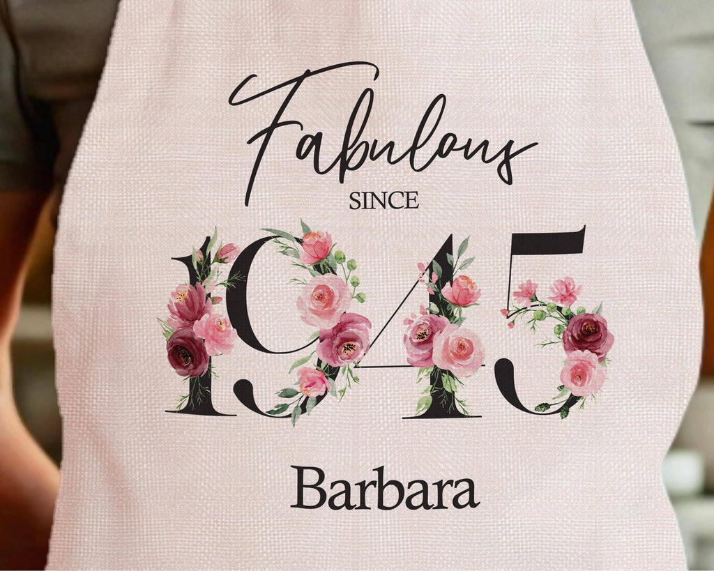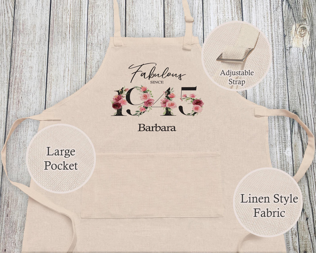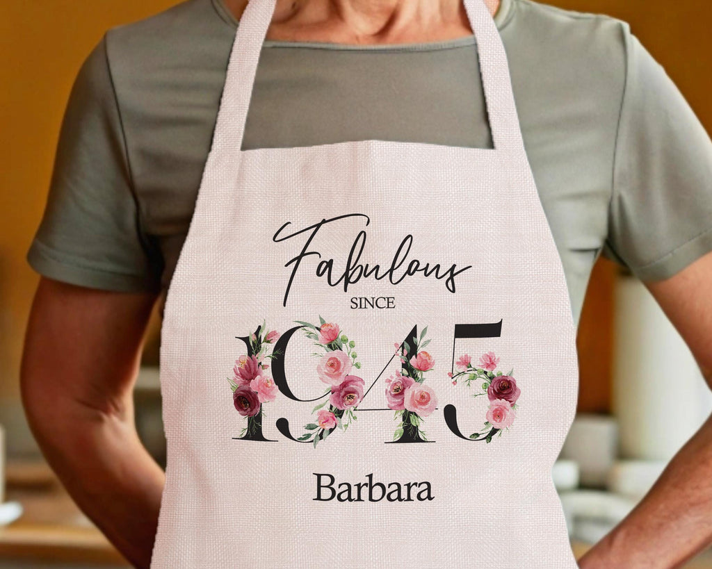 Our 80th birthday personalised apron is sure to make an amazing keepsake gift - Designed with a feminine floral 1945 design, it will look wonderful in any ladies kitchen - We can change the age, making it the ideal gift for Mum, Daughter, Sister, Nan, Grandma, Godmother or family friends. Also available with a matching notebook.