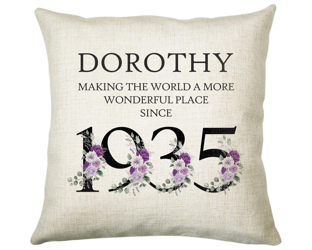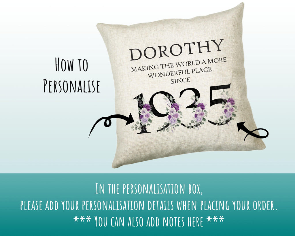 Our 90th birthday cushion is sure to make an amazing keepsake gift - Designed with a feminine floral 1935 design, it will look wonderful in any ladies home - Ideal for Mum, Nan, Grandma or family friends. Also available with a matching mug and coaster.