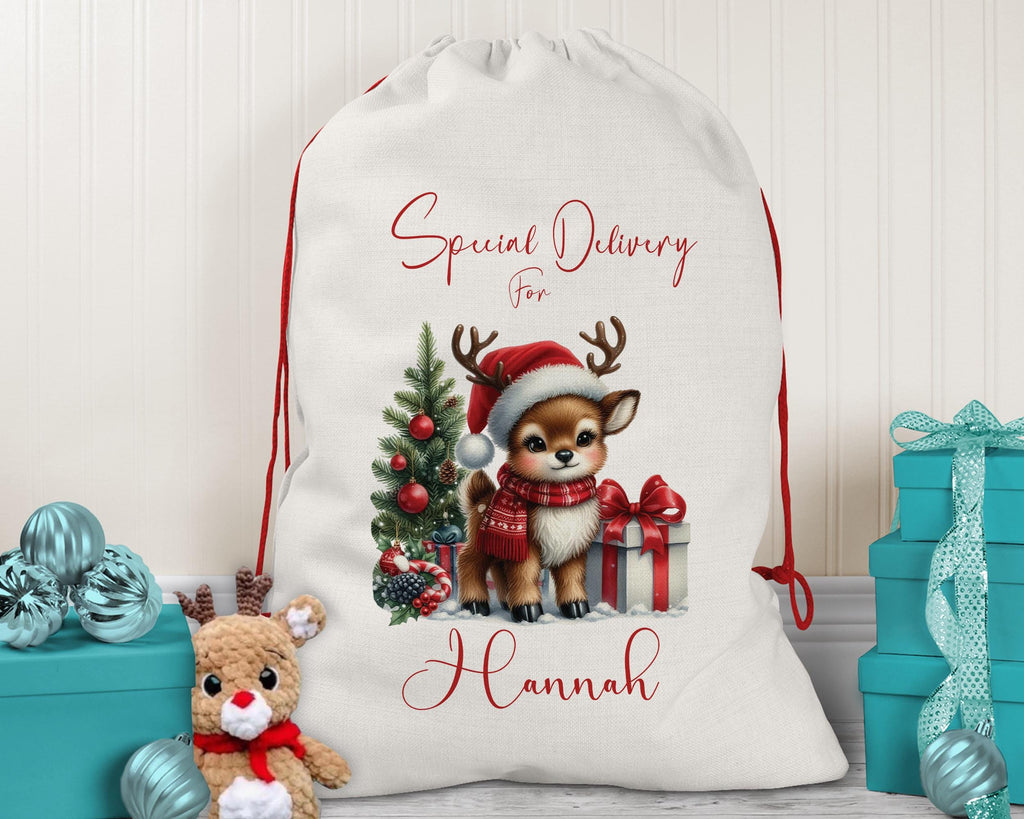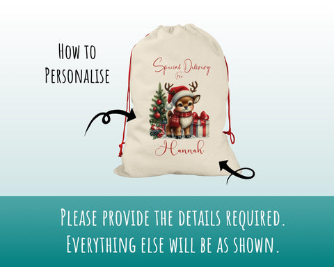 Large Personalised Xmas Reindeer Tree Design Christmas Sack / Stocking - Great Decoration for under the Christmas tree for your little ones. Designs available for both boys and girls.
