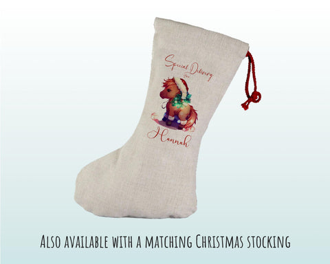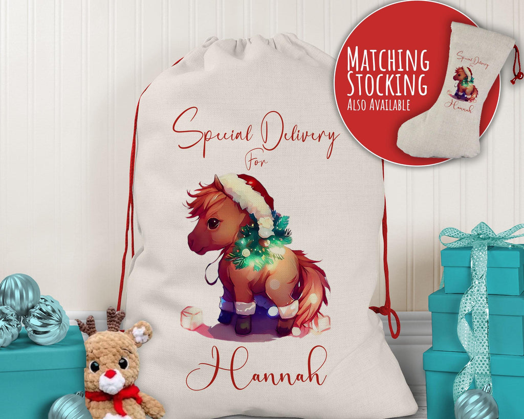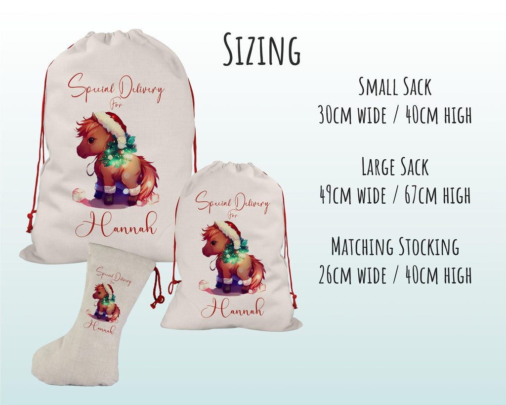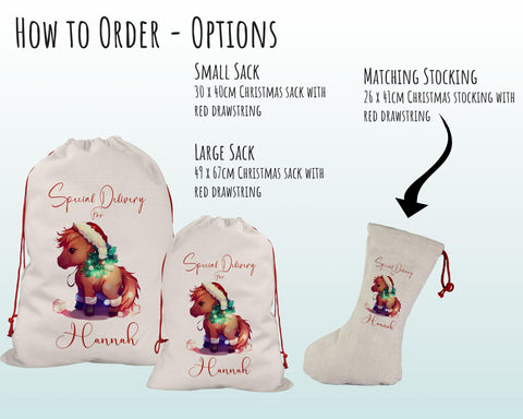 Large Personalised Xmas Rocking Horse Design Christmas Sack / Stocking - Great Decoration for under the Christmas tree for your little ones. Designs available for both boys and girls.