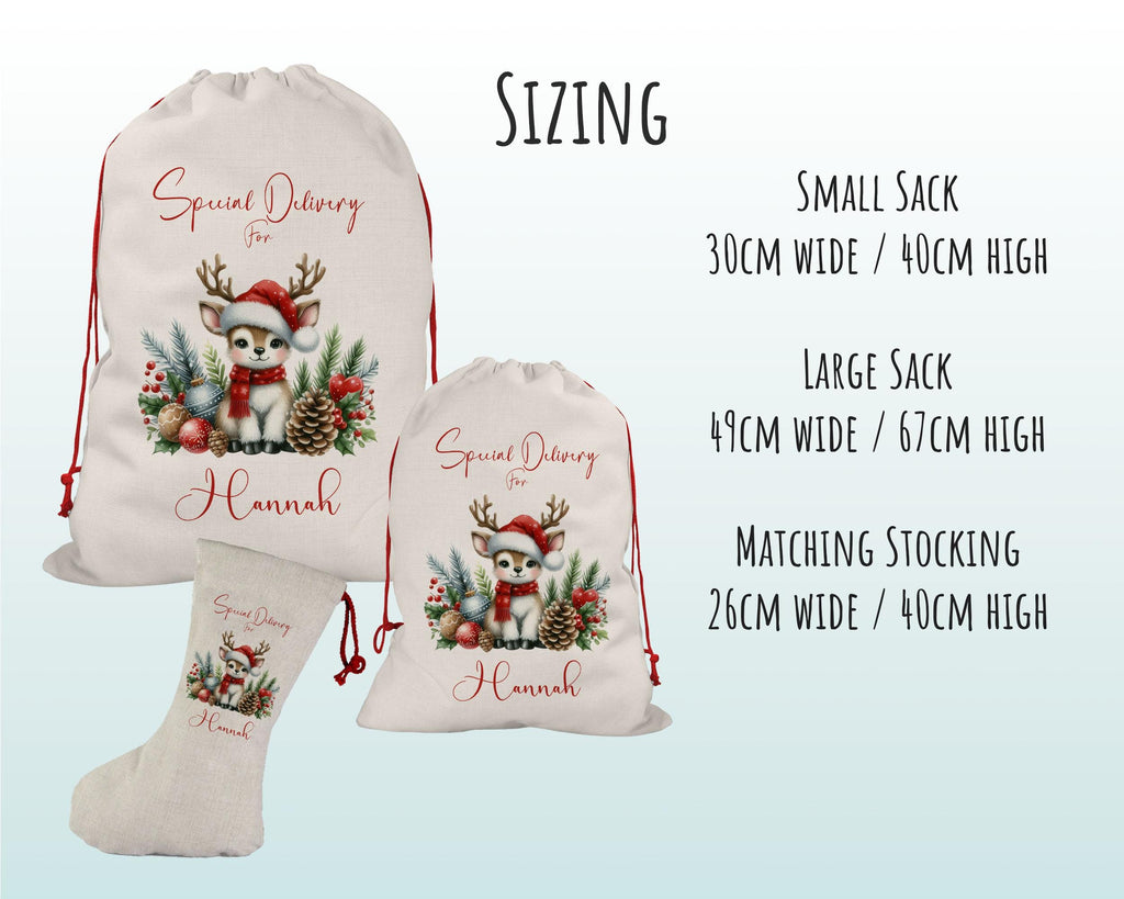 Large Personalised Xmas Reindeer Pine Cone Design Christmas Sack / Stocking - Great Decoration for under the Christmas tree for your little ones. Designs available for both boys and girls.