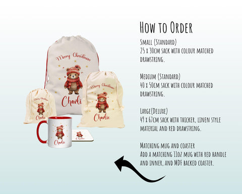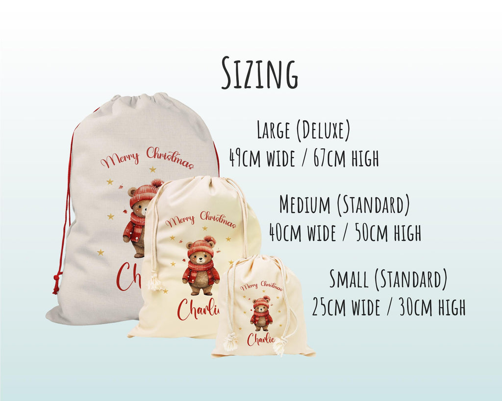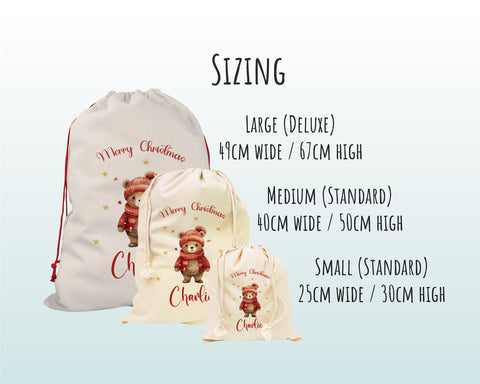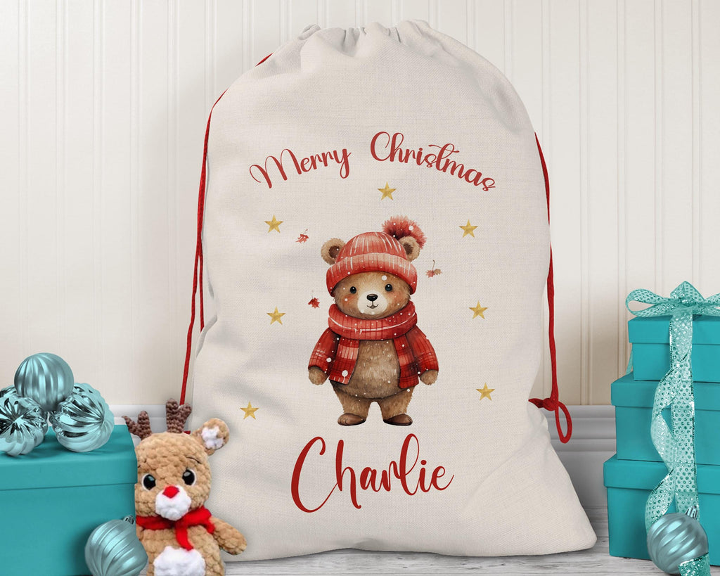 Large Personalised Xmas Cute Bear Design Christmas Sack / Stocking - Great Decoration for under the Christmas tree for your little ones. Designs available for both boys and girls.