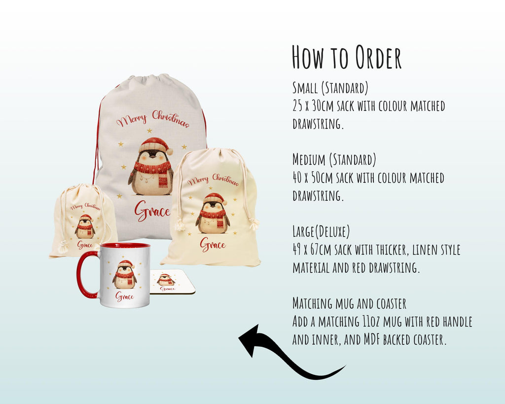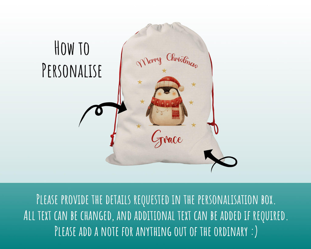 Large Personalised Xmas Cute Penguin Design Christmas Sack / Stocking - Great Decoration for under the Christmas tree for your little ones. Designs available for both boys and girls.