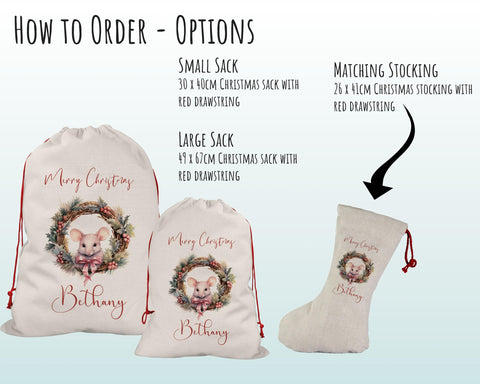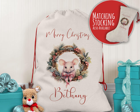 Large Personalised Xmas Wreath Mouse Design Christmas Sack / Stocking - Great Decoration for under the Christmas tree for your little ones. Designs available for both boys and girls.