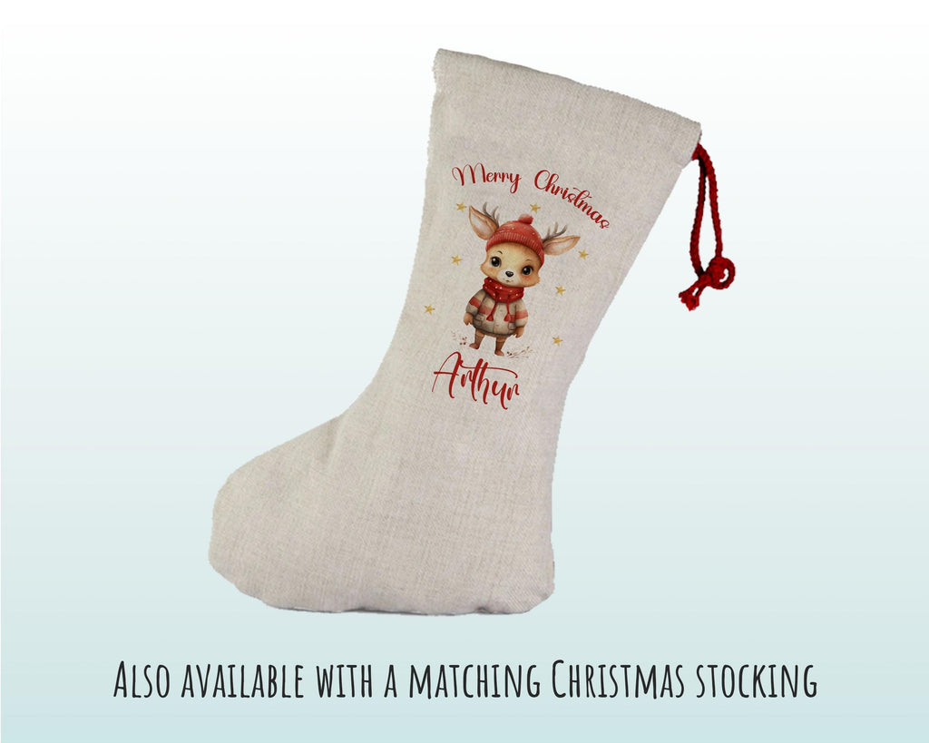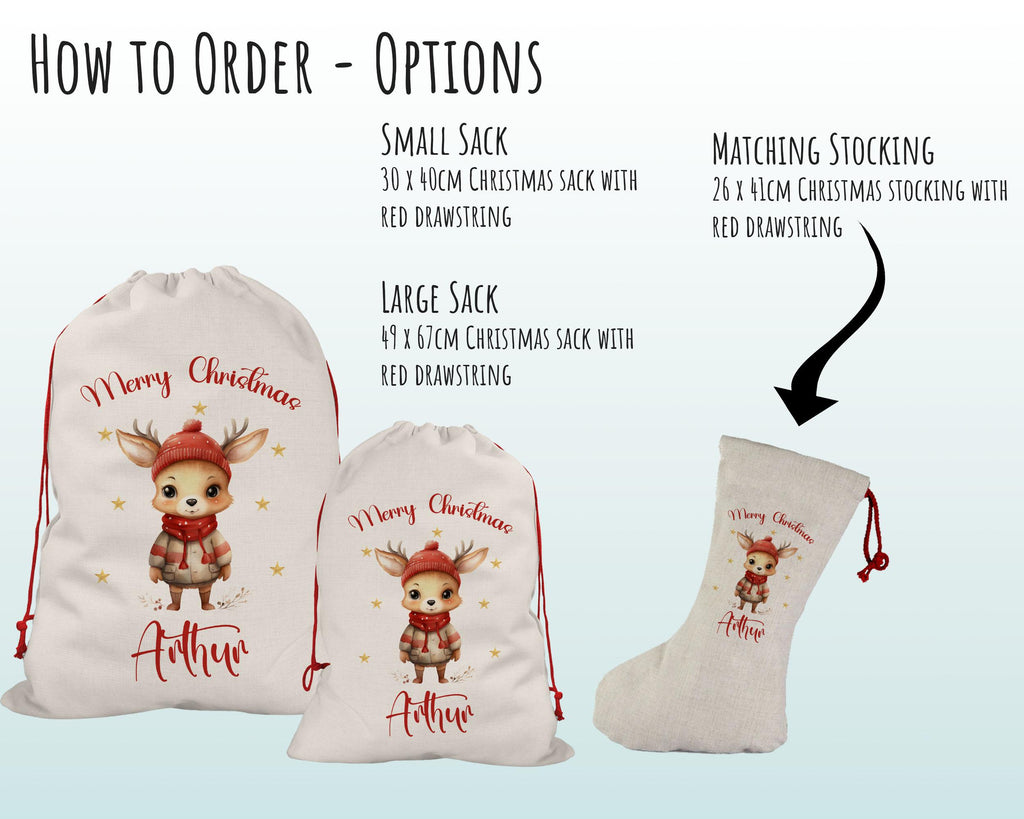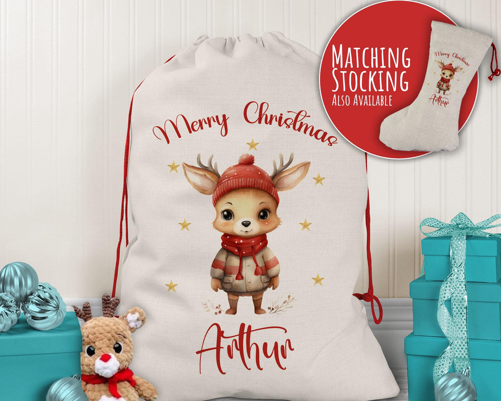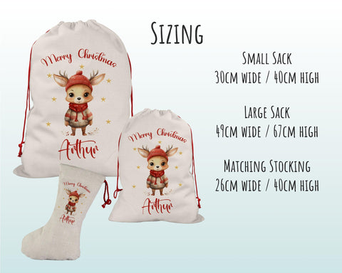 Large Personalised Xmas Cute Reindeer Design Christmas Sack / Stocking - Great Decoration for under the Christmas tree for your little ones. Designs available for both boys and girls.