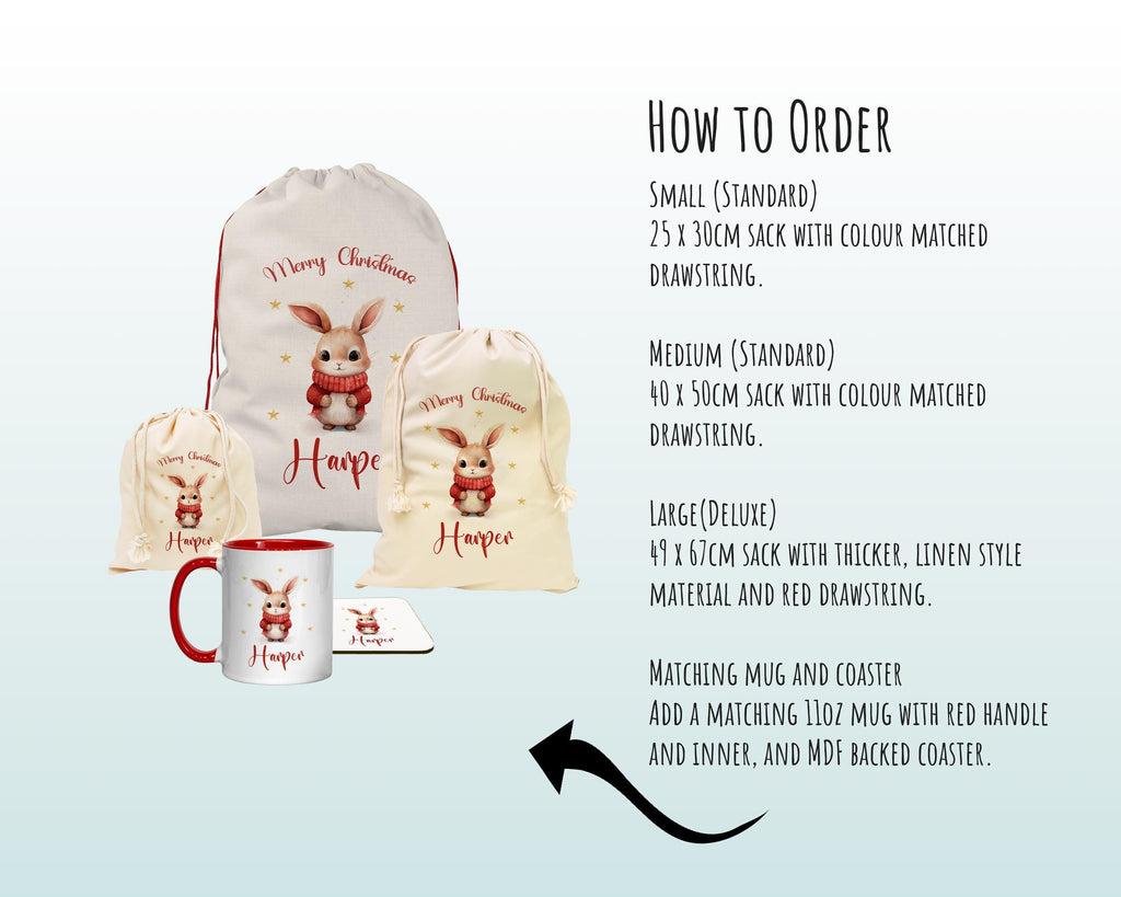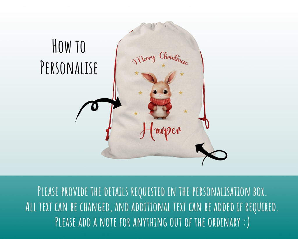 Large Personalised Xmas Cute Bunny Design Christmas Sack / Stocking - Great Decoration for under the Christmas tree for your little ones. Designs available for both boys and girls.