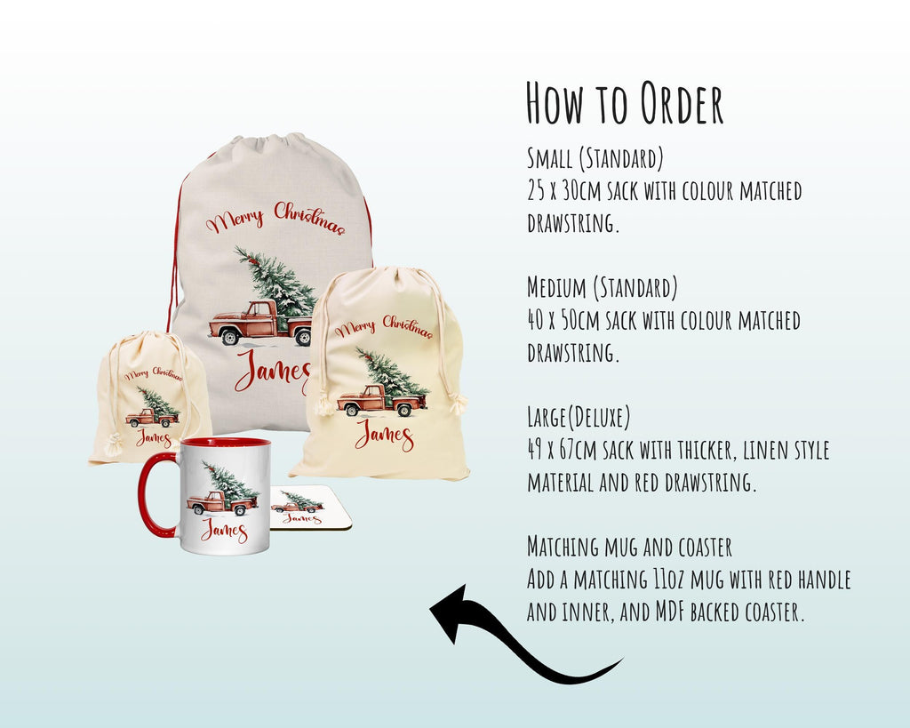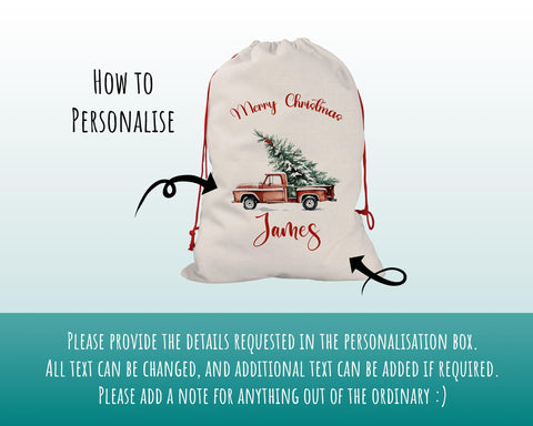 Large Personalised Xmas Tree and Truck Design Christmas Sack / Stocking - Great Decoration for under the Christmas tree for your little ones. Designs available for both boys and girls.