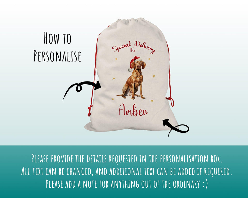 Personalised Hungarian Vizsla Christmas Sack / Stocking - Great Decoration for under the Christmas tree and to include your beloved pooch in the Christmas morning fun!