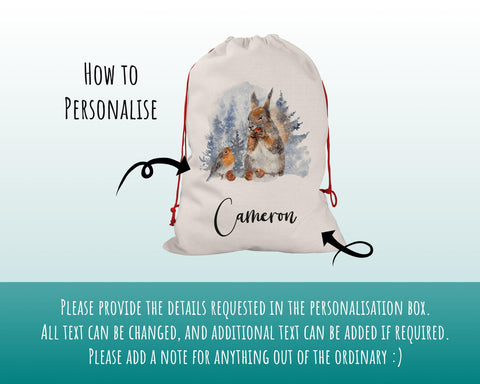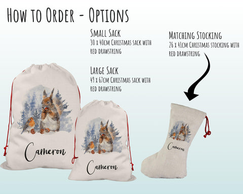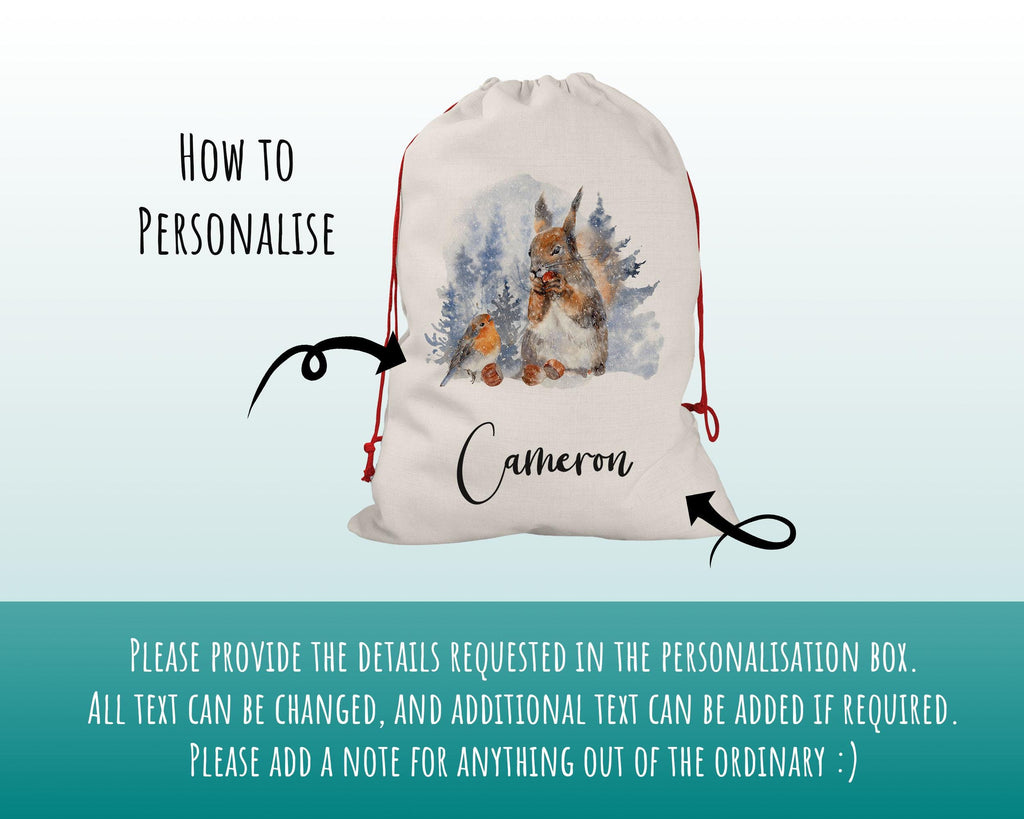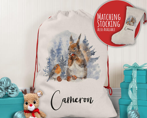 Personalised Large Christmas Sack Robin and Squirrel Design Xmas Stocking Gift Rudolph Sack Red Drawstring Christmas Decoration SK073