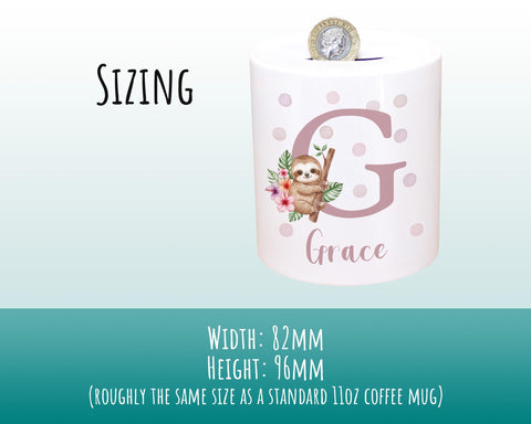 Our personalised sloth money boxes are the perfect gift for new mums and dads welcoming their new baby girl into the world. Personalised with custom initial and name, and with a beautiful watercolour baby sloth.